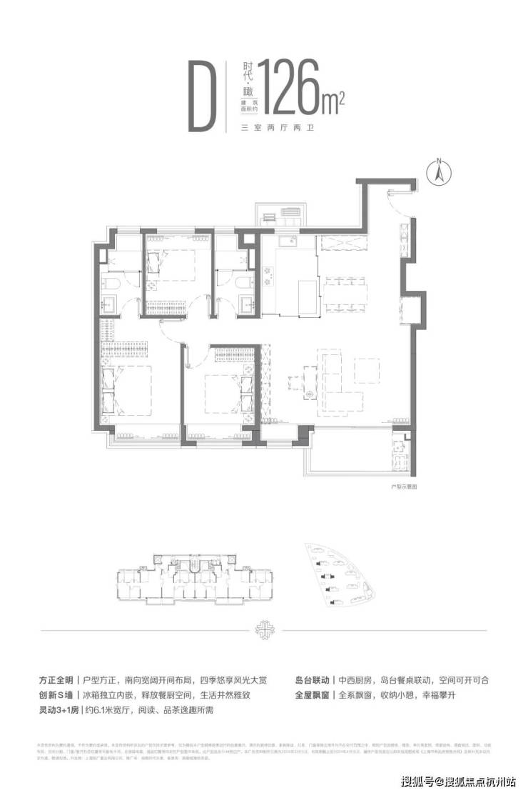 建面约126m²三房两厅两卫户型,南向3+1面宽横厅设计,让空间更加随心而变。主卧双台盆配置,用空间拥抱自然中的无限自在。