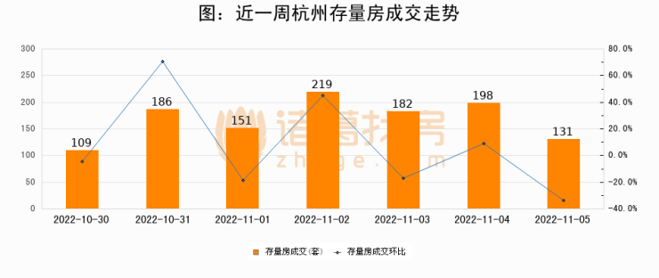 从存量房来看,2022年11月05日杭州存量房单日成交131套,比昨日减少67套,环比下降33.8%。从近一周存量房成交来看,杭州存量房日均成交套数为168套,其中11月02日成交量较高为219套,11月05日单日成交131套,低于近一周平均水平22%。