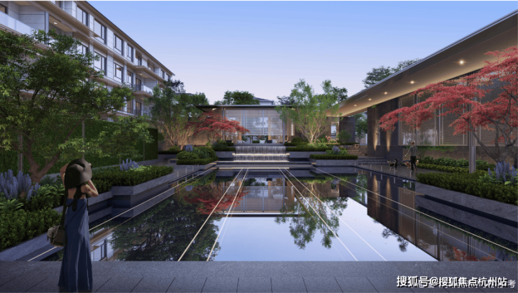 中央水景联动地面景观及地下会所空间,通过三层叠水形成了特色鲜明的水景庭院,引领未来社区发展新趋势。