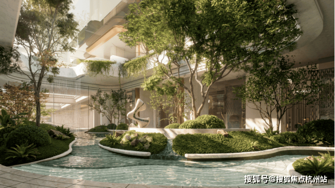 项目还规划了下沉式庭院,搭配叠水、绿植,形成立体景观。在滨江这种地段,愿意把土地拿出来做景观,本身就是一个态度。