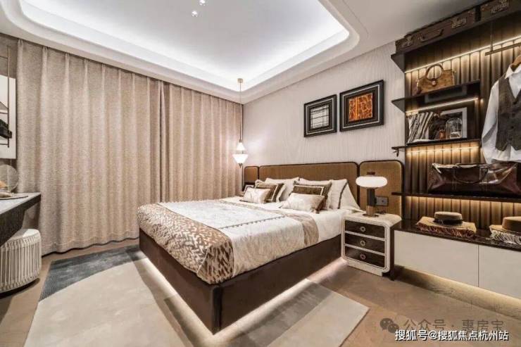 放下标准尺寸大床之后,两侧还能从容走过。衣柜的进深足够深,男女主人的四季衣物各得其所。