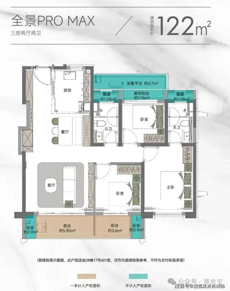 建面约122㎡3房,这个面积做3房,同时还附加了3阳台+飘窗+可创变空间等优势。