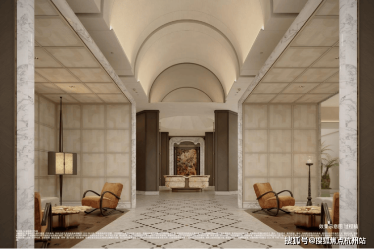 归家八角厅:以法式为底蕴,地面与墙面精选贝金米黄大理石与卡拉白大理石铺陈,纹理如山水画般自然流动。