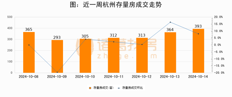 从存量房来看,2024年10月14日杭州存量房单日成交393套,比昨日增加29套,环比上涨8%。从近一周存量房成交来看,杭州存量房日均成交套数为335套,10月14日单日成交393套,高于近一周平均水平17.3%。