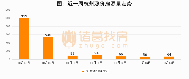 根据诸葛找房数据显示,杭州24小时涨价房源量为64套,较10月13日增加8套,环比上涨14.3%。与此同时,涨价房源占比小幅扩大,业主信心有所提升。