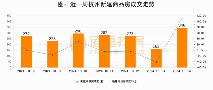 根据杭州市住房保障和房产管理局数据显示,2024年10月14日杭州新建商品房成交346套,较昨日增加183套,环比上涨112.3%