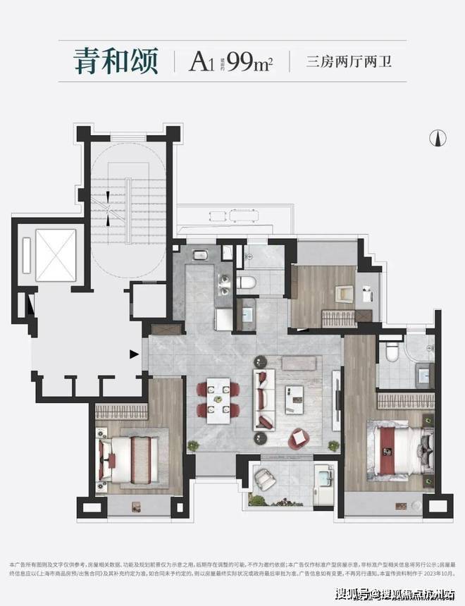 约99㎡3房2卫户型是上海市场中最主流的面积段之一,但印象青城的户型设计却超脱以往。