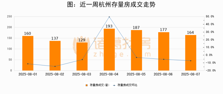 从存量房来看,2025年08月07日杭州存量房单日成交164套,比昨日减少13套,环比下降7.3%。从近一周存量房成交来看,杭州存量房日均成交套数为163套,08月07日单日成交164套,高于近一周平均水平0.6%。