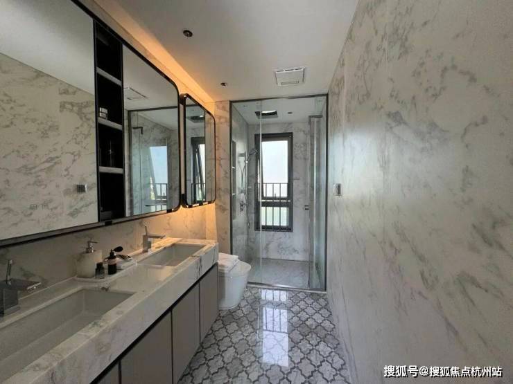 双卫配置,其中一个做了干湿分离,科勒台盆+双智能马桶+高仪花洒,除雾镜柜均内置了牙刷消毒器、预留吹风机插座。主卫镜柜还有美妆冰箱,收纳空间相当充足。