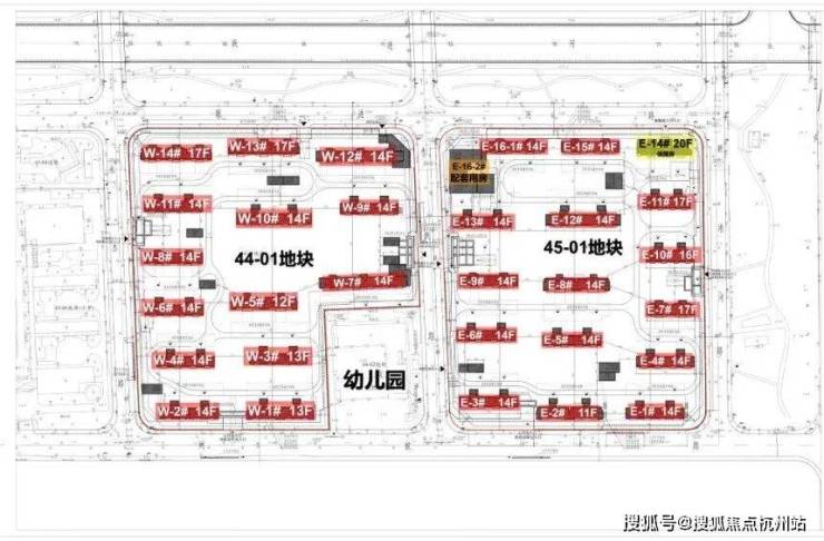 根据设计方案显示,44-01地块拟建 14栋12-17层的高层 ;45-01地块拟建 16栋11-17层高层住宅 ,其中E-14#为保障房。
