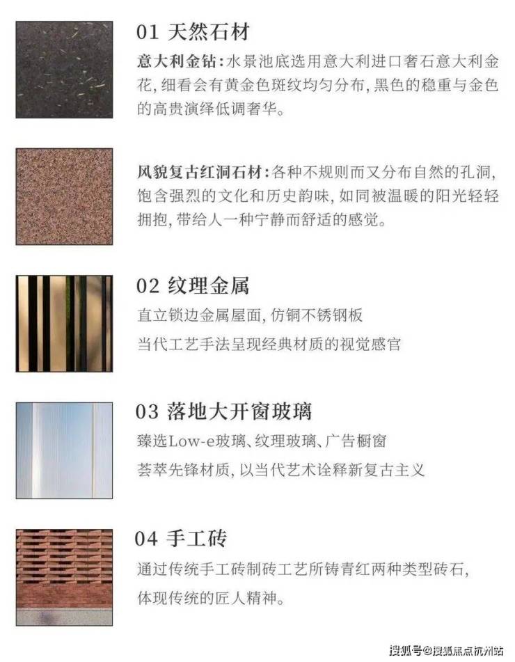 项目采用天然石材和现代工艺相结合的手法,水景池底则选用意大利进口奢石金钻,大门选用风貌复古红洞石材。