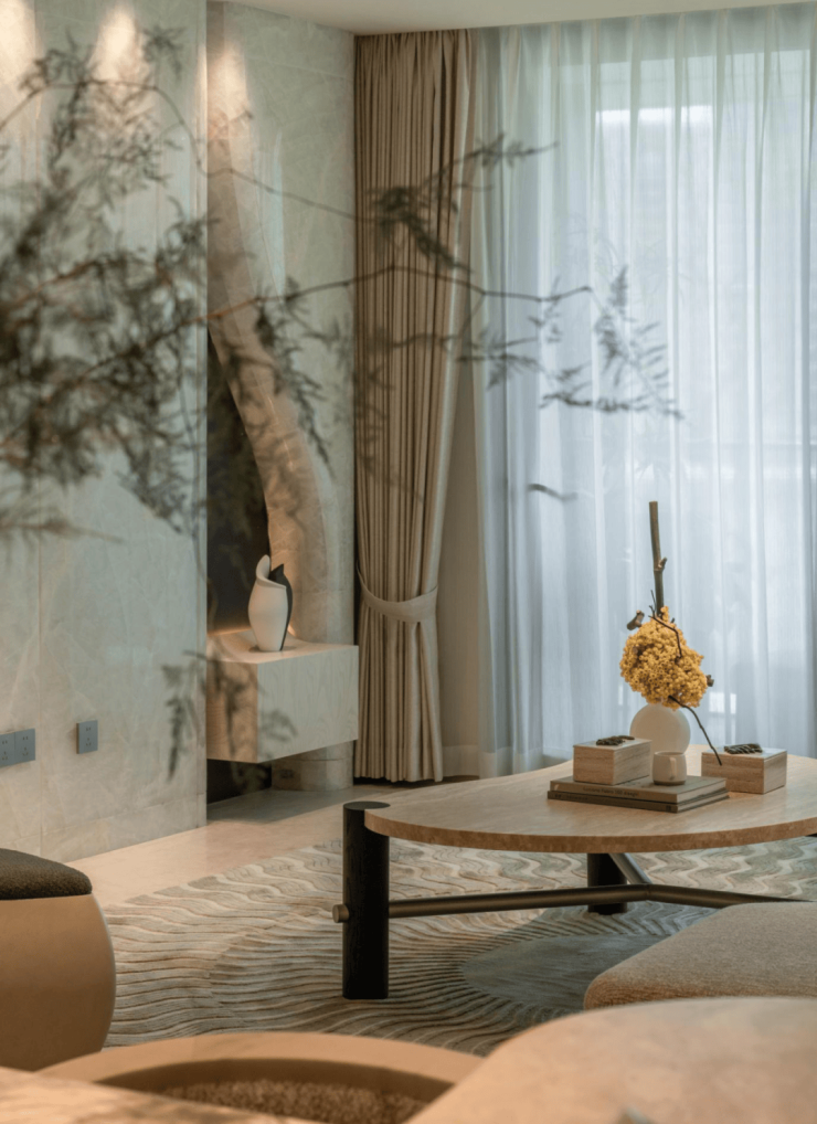 陶砚176,整体调性温和而宁静,客厅背景墙以透绿冰玉为载体,呈现陶砚台的温润触感,宛如一块从时光中走来的艺术品,带有浓厚的传统气息,又不失现代的简约与精致。这种温润的气质与包容性,正契合了现代人对“家”的理解与渴望。