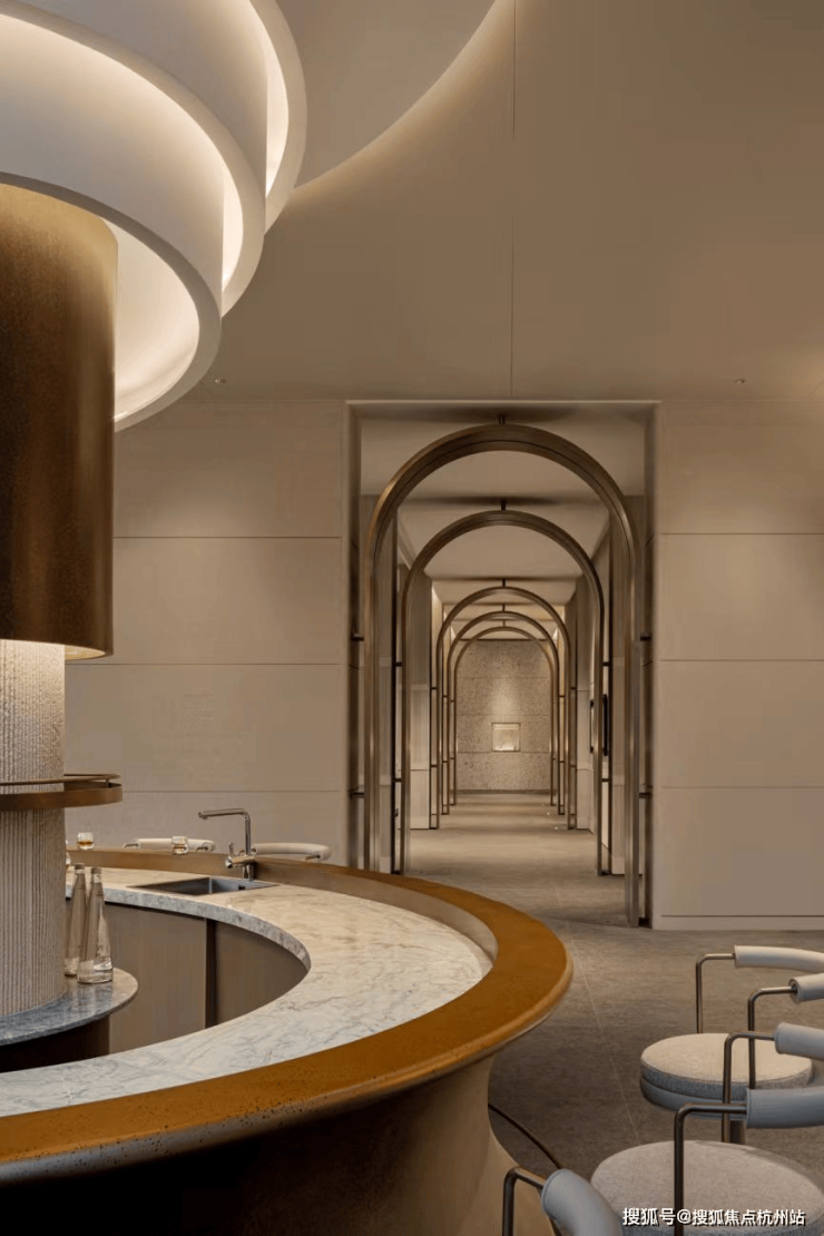 社区门头:立面设计更是将工艺美学与生活体验完美结合。内外双重门厅景墙运用了曲面月光米黄石层叠设计,层间搭配香槟金不锈钢,打造自然、峡谷意境,曲面不仅复刻钱塘江潮起潮落的流畅动感,更能在不同光线下呈现温润细腻的质感,让建筑随着日光变化展现不同美感。
