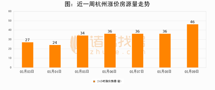 根据诸葛找房数据显示,杭州24小时涨价房源量为46套,较05月08日增加10套,环比上涨27.8%。与此同时,涨价房源占比小幅扩大,业主信心有所提升。