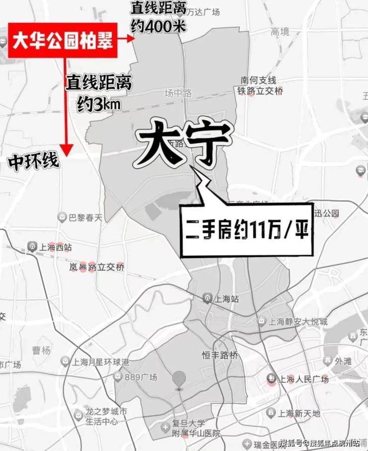 为什么说「大华·公园柏翠」的地理位置绝佳?因为它直线距离静安区只有400米,直线距离中环线只有3km,地理位置决定了享受到的资源浓度,大宁的繁华咫尺可得。