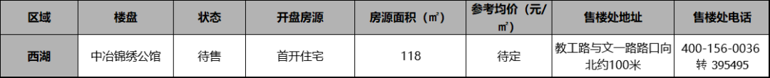 西湖区仅一盘上新中冶锦绣公馆。项目位于文教板块,锦绣公馆是现房项目,目前商业部分房源已经推出,住宅房源迟迟没有动静,基本上每个月的开盘盘点都能列入,但也都屡屡爽约,近期,几个现房项目动作频频,想必锦绣公馆的入市也快了。
