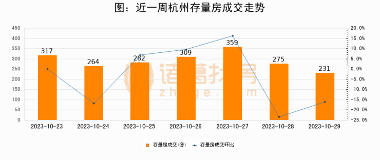 从存量房来看,2023年10月29日杭州存量房单日成交231套,比昨日减少44套,环比下降16%。从近一周存量房成交来看,杭州存量房日均成交套数为291套,10月29日单日成交231套,低于近一周平均水平20.6%。