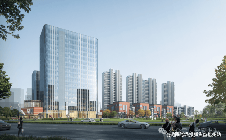 建筑风格:采用玻璃幕墙+顶部金色格栅塔冠设计,现代简约风格。