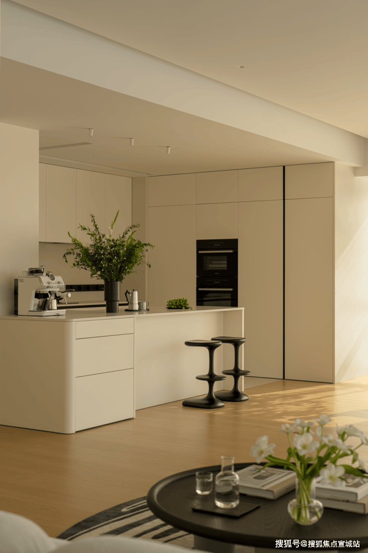全开放式设计,岛形沙发打破边界,让交流随光影自由发生。午后的光线从侧面洒落,家具被赋予立体的光影层次。