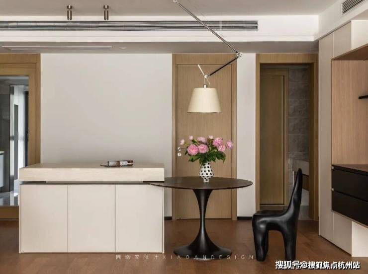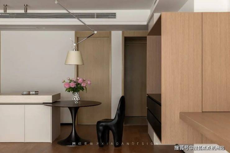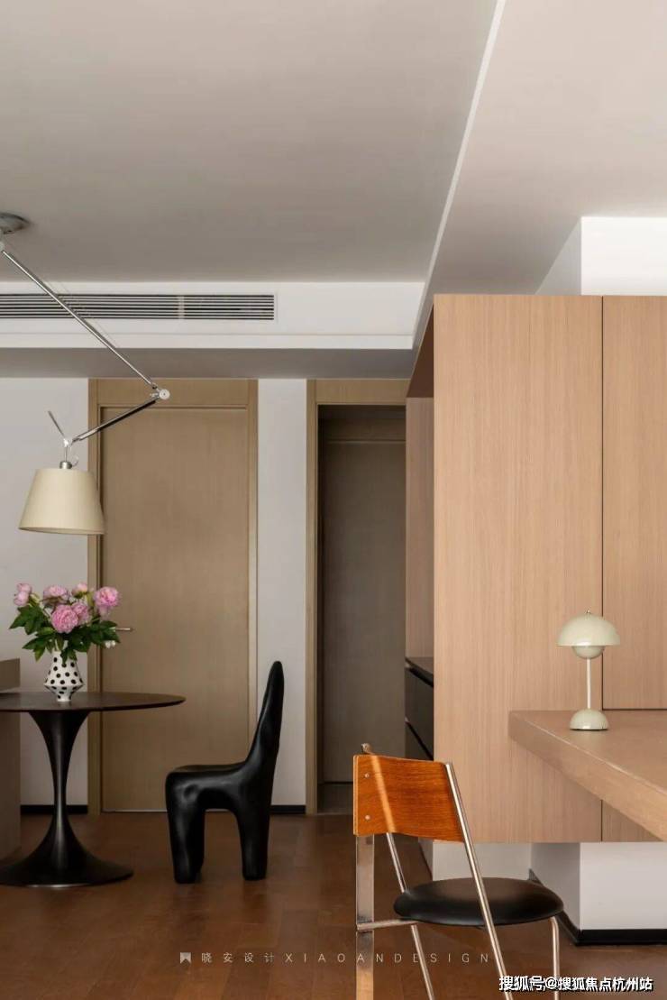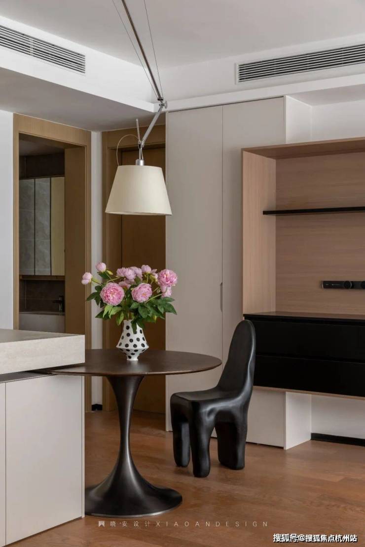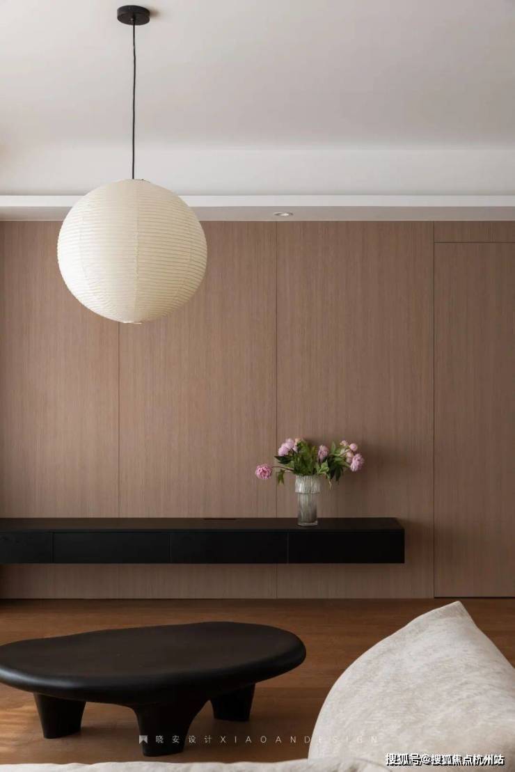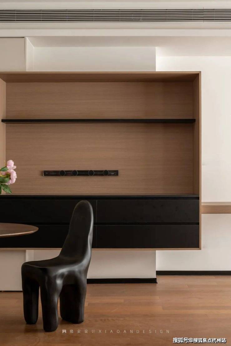 餐边柜实用简洁,延续了原木与黑色的经典搭配,柜体之间的前后错落,营造出丰富的层次感,让空间趣味盎然。在这里,烟火气与温馨感温柔共生,亲友相聚,谈笑风生,美食与情谊在此沉淀,点点滴滴都是生活最温暖的模样。