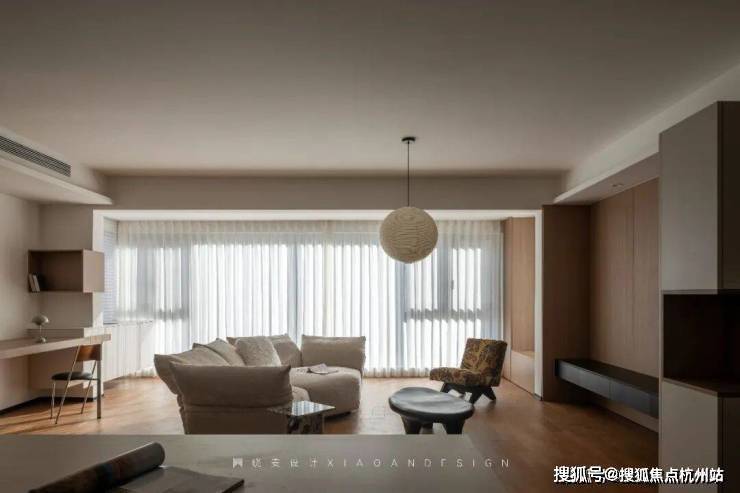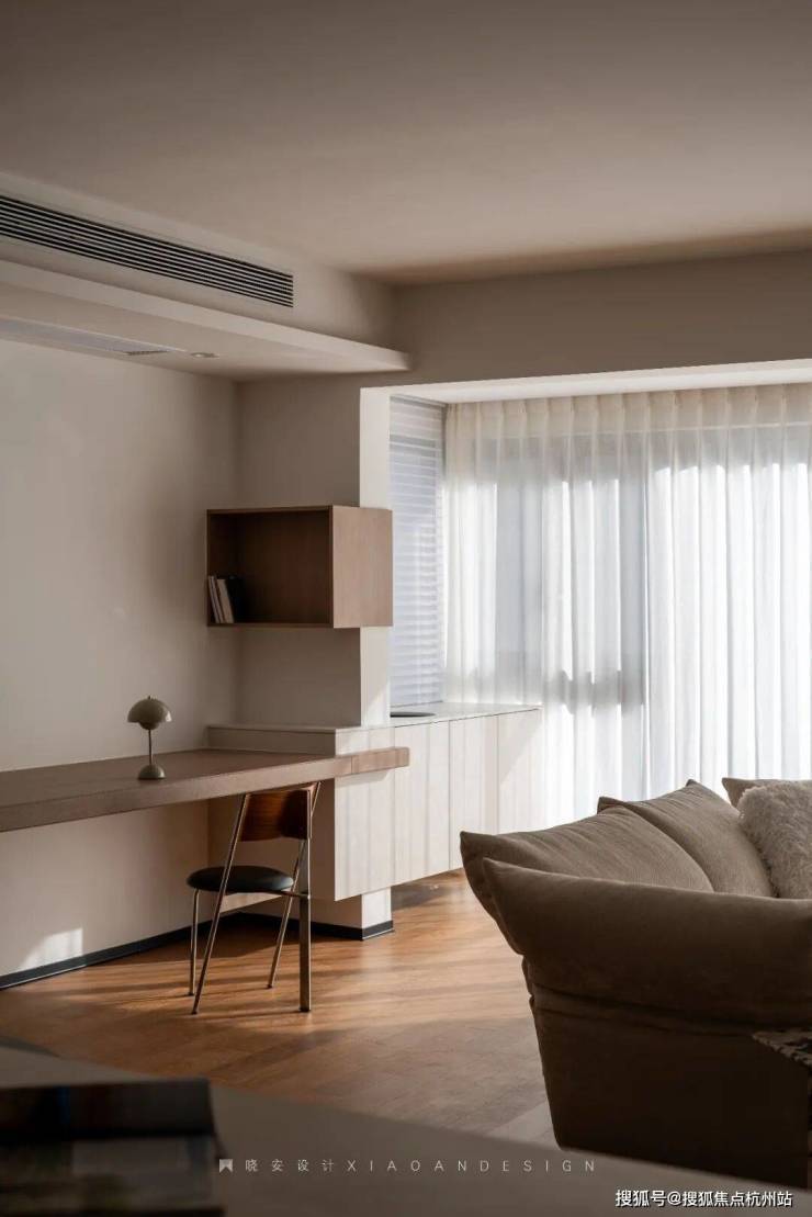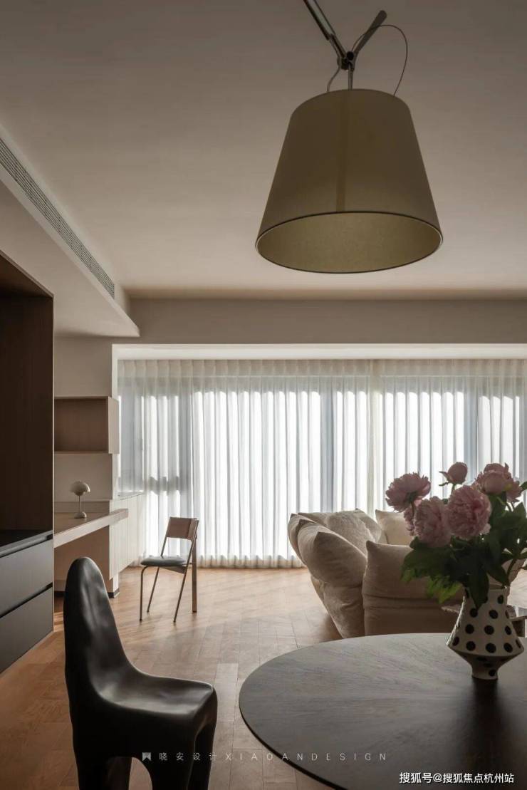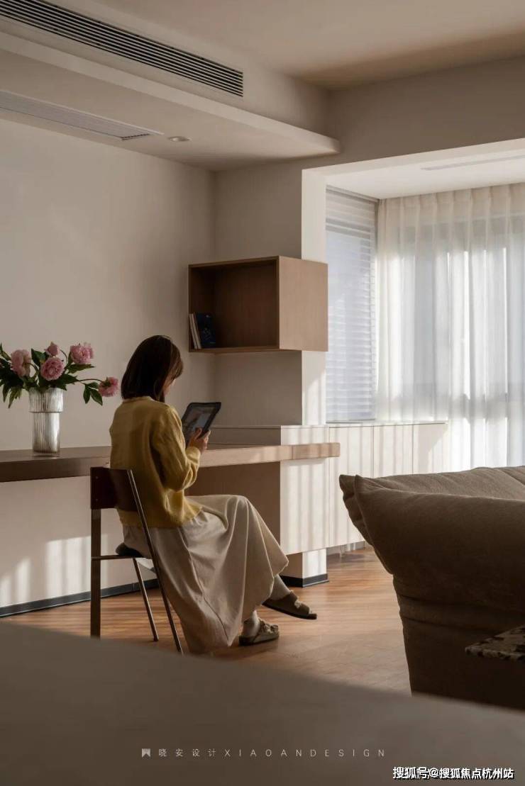 工作台旁,仰头可见阳光跳跃,粉色花束悄然装点,为空间注入自然气息。阳光透过窗帘温柔洒落,让整个客厅都充满了呼吸感,每一处细节都在诠释着生活本真的美好。
