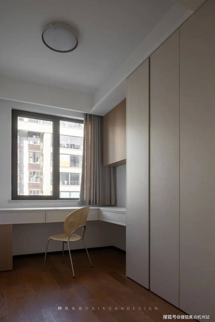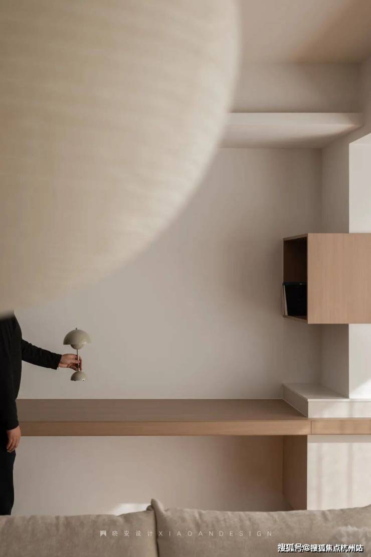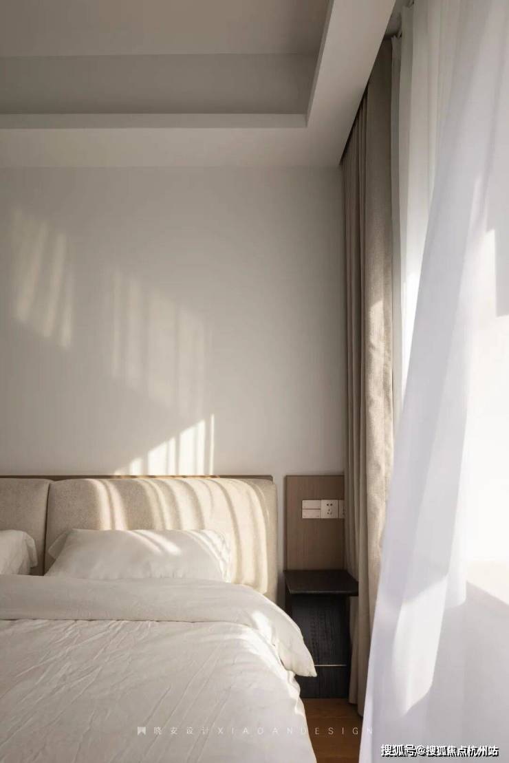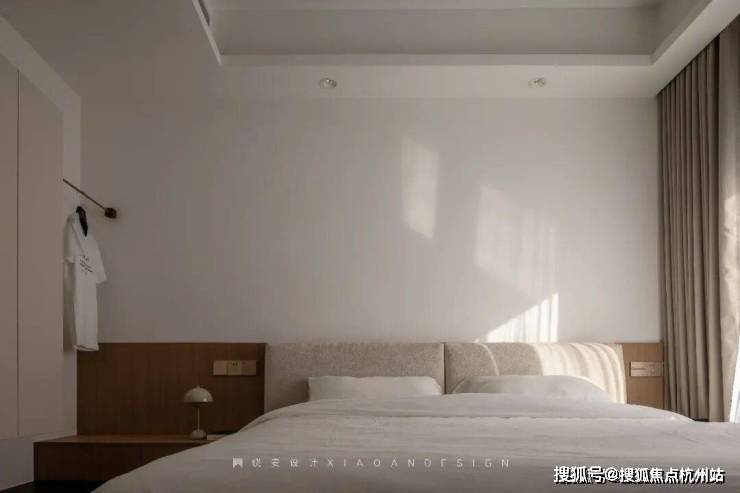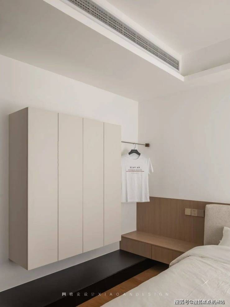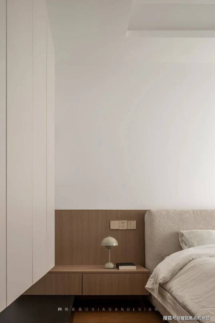 主卧轻盈温柔,悬浮柜体与黑色地台在色彩与高低关系上形成呼应,构建出和谐统一的视觉效果。设计师将光影、隐性灯光与空间感精妙融合,让每一个细节和角落都恰到好处,营造出静谧而治愈的氛围。