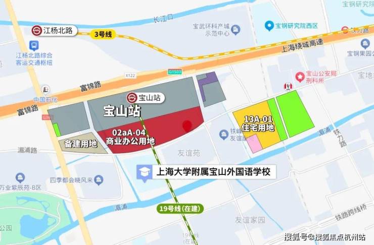 项目地处宝山杨行板块,是19号线宝山站(在建)TOD综合体地块。地块用途为商业、住宅、办公、餐饮旅馆混合,其中13A-01为住宅,容积率2.3,装修标准2500元/㎡。