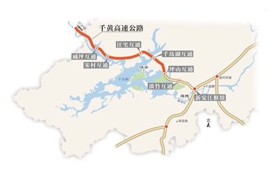 而建设中的千黄高速,将打通这条高速“断头路”。线路东端与杭新景高速公路千岛湖支线相接,一路经过淳安县千岛湖镇、宋村乡和威坪镇等地,再进入安徽境内。浙江境内路段全长51.42公里,按双向四车道高速公路标准建设,设计行车速度为80公里/小时。
