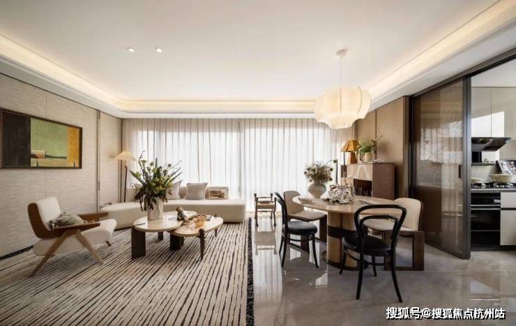 主入口知·云栖,取意西湖十景以"洄游"为理念,超52米跨度的回字形布局,重构传统"四水归堂"空间序列,约2.4米“流光礼宾” 塔冠,如悬浮的美学灯塔,与金色挑檐相映成辉,全封闭式阳台勾勒建筑轮廓,让立面如镜幕般收纳约30公里江岸鎏光!