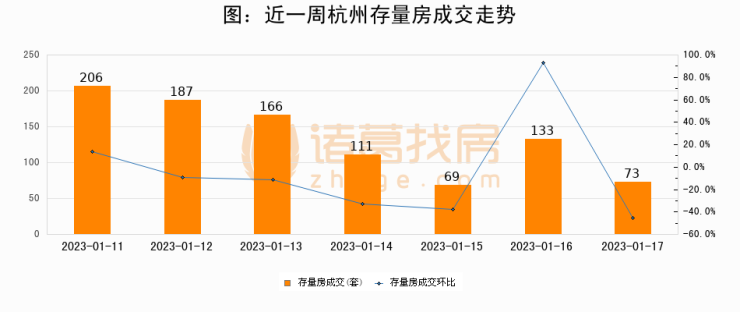 从存量房来看,2023年01月17日杭州存量房单日成交73套,比昨日减少60套,环比下降45.1%。从近一周存量房成交来看,杭州存量房日均成交套数为135套,其中01月11日成交量最高为206套,01月17日单日成交73套,低于近一周平均水平45.9%。