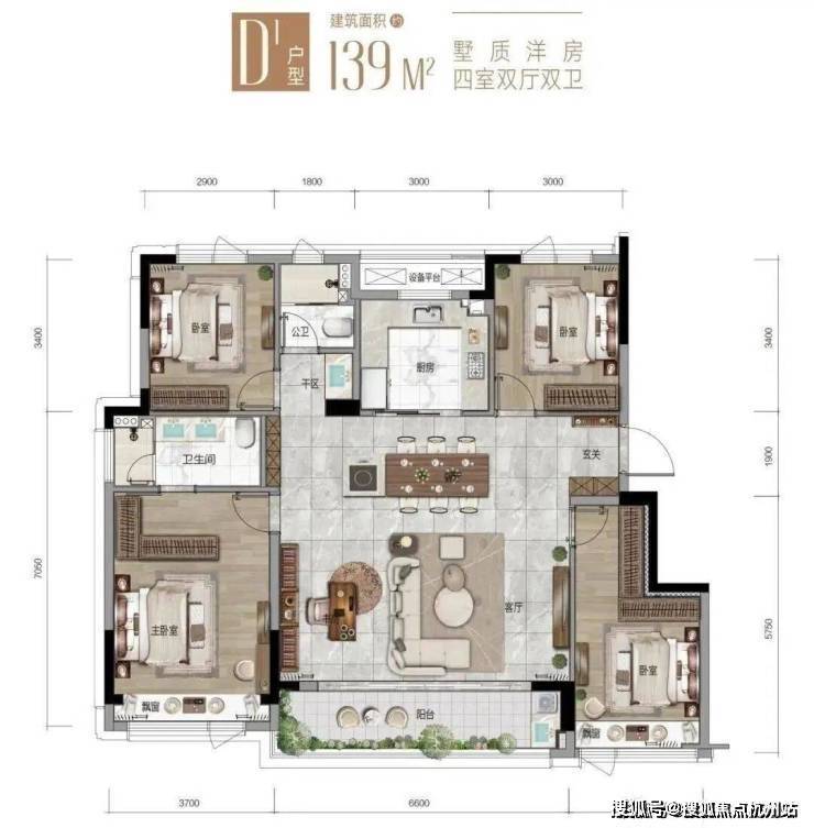 建面约139㎡的大四房,四开间朝南,主卧面宽约3.7米。包括北面书房在内,另外三个房间的面宽都达到约3米,不会觉得局促。
