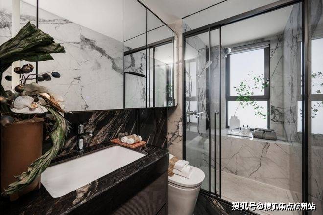 卫浴墙面采用 寒江雪大瓷砖铺装,淋浴部分地面选用整块 天然大理石