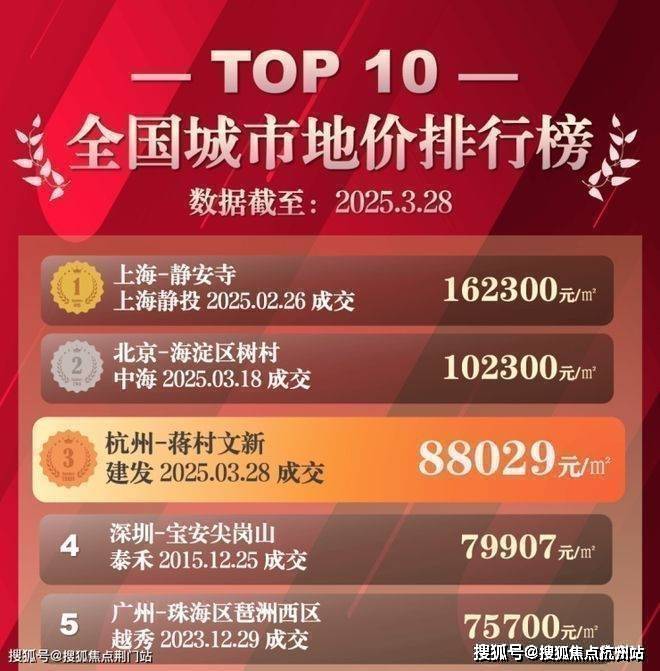 3月25日,滨江水电新村地块以7.74万/㎡的楼面价刷新了纪录;短短三天后,蒋村低密宅地更以8.8万/㎡的价格将杭州推进全国地价TOP3。