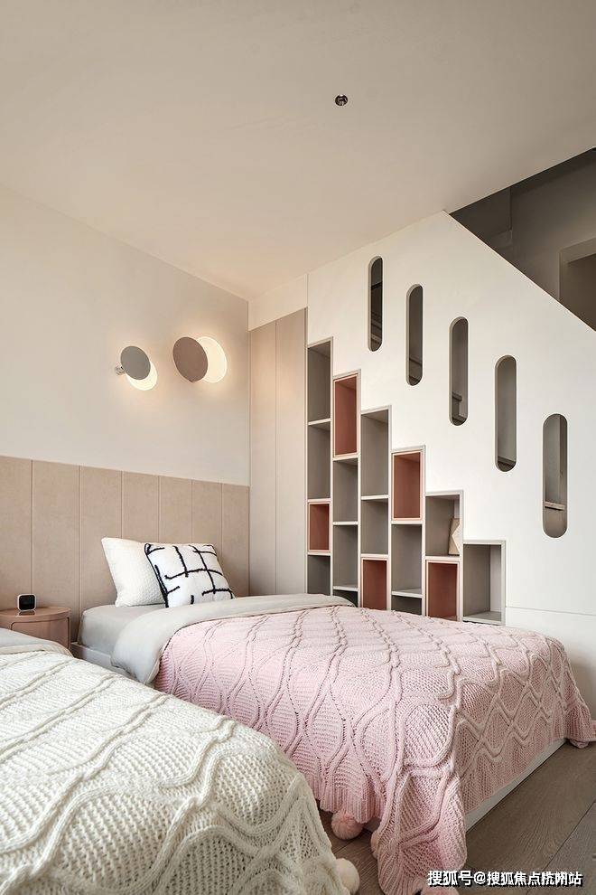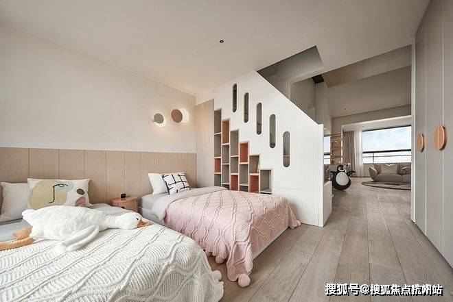 女儿房选取浪漫梦幻的粉色作为主色调,柔和明快,充满童真与童趣,小心翼翼地呵护两个女儿的公主梦。