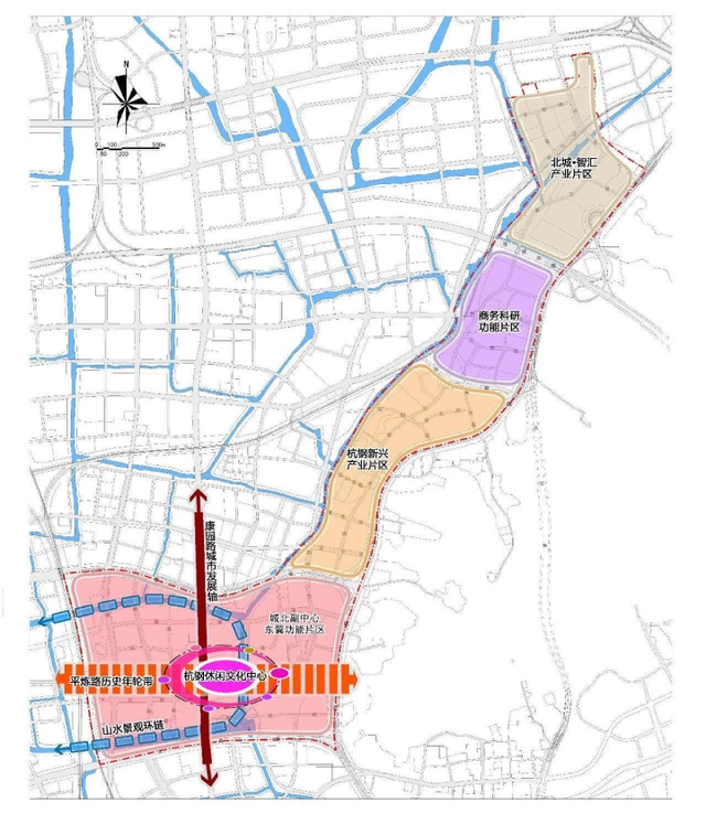 “四片区”:即康桥路以南的综合功能片区、康桥路以北到刘一路的杭钢新兴产业片区、刘一路以北至绕城高速公路的商务科研功能片区、绕城高速公路以北的北城·智汇产业片区。