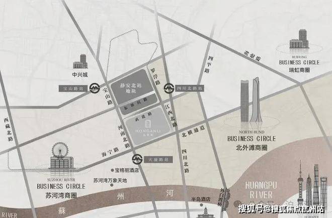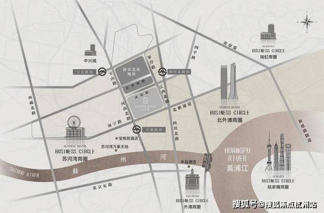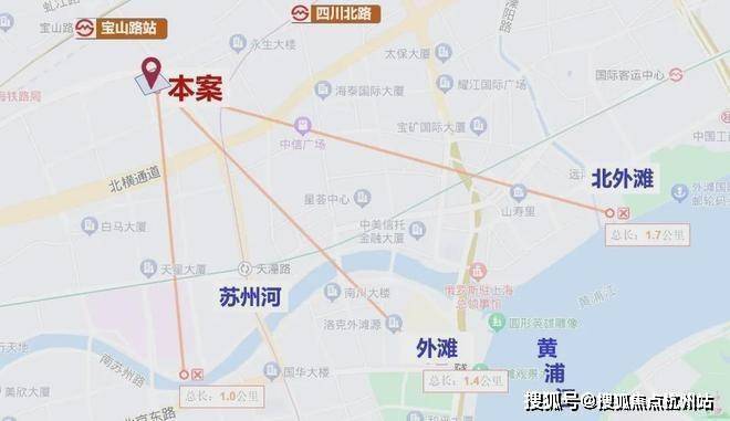 仅从图上看,该地块直线距 苏州河约1公里 ,直线距 外滩约1.4公里 ,直线距 北外滩约1.7公里 ,直线距 3/4号线宝山路站约300米 ,直线距 10号线四川北路站约560米 ,区位优势明显。