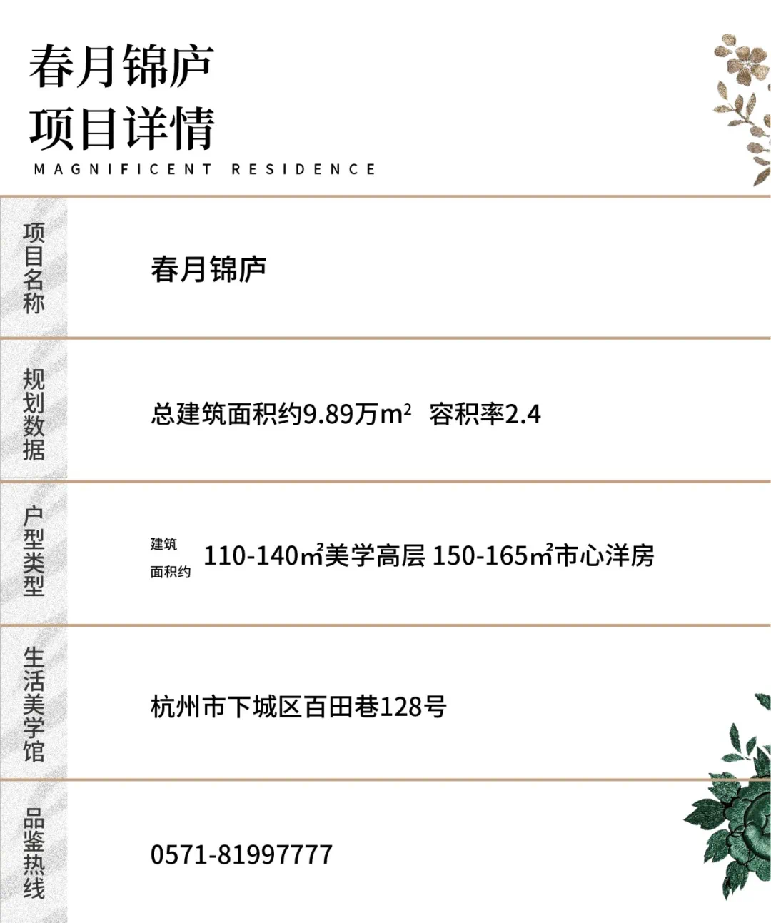 本资料为要约邀请,买卖双方的权利义务以书面合同及政府最终审批文件为准。项目推广案名为【春月锦庐】,核准地名为【春月锦庐】,开发商【杭州绿城致昇置业有限公司】,预售证号:杭售许字(2020)第000128号。文中所涉图片,因工艺、材质和比例所限,与实景存在一定差异,外立面、部分建筑、设施、园林景观、周边环境等信息后期可能存在变更,最终交付以政府部门核准文件及双方商品房买卖合同约定内容为准,一切未列举事项或更改,不再另行通知;文中所涉规划设置、市政配套设置不排除因政府规划、政策规定及出卖人未能控制的原因而发生变化,本资料旨在提供相关信息,不代表着出卖人对此作出要约或承诺;部分图片来源于网络,如有侵权,请联系删除。本次资料的发布时间为2020年12月,有效期1个月,本公司保留对本资料修改的权利且不再另行通知。