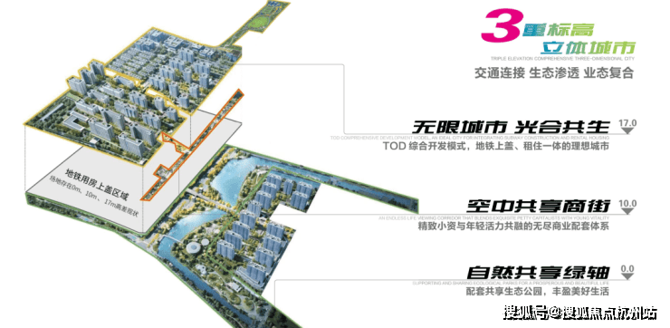 二度 标高10m:配有生活服务配套,商业、公园、办公。1万㎡精致生活配套 、 盖上商业文化、体育文化、养老医疗、行政管理健康四轴。
