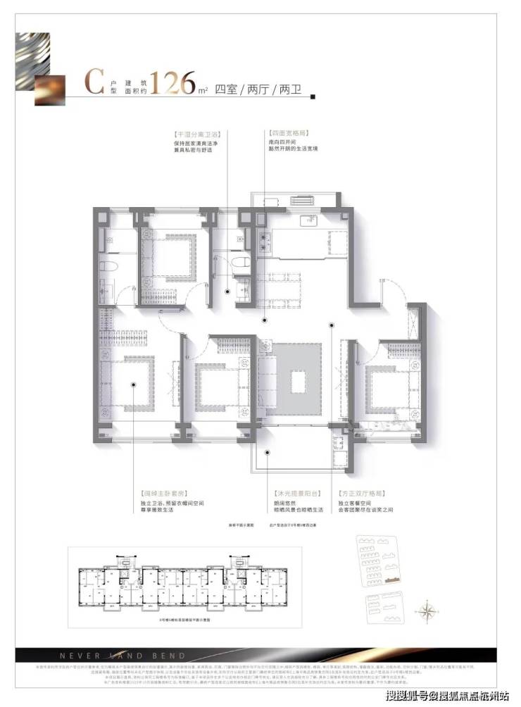 建面约126㎡真四房,进一步强化功能性,户型方正,四开间朝南,南北通透,南向卧室均带有大飘窗设计,拓宽了室内景观视野的同时,增加了实际空间使用率,有效避免面积浪费。