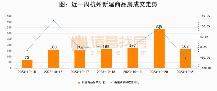 根据杭州市住房保障和房产管理局数据显示,2023年10月21日杭州新建商品房成交167套,较昨日减少172套,环比下降50.7%