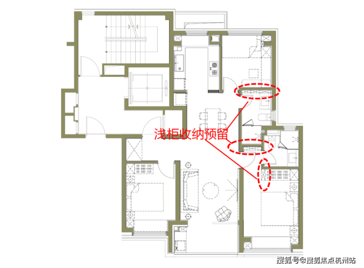 特别的是,这个户型的收纳设计走心了。在卫生间的侧面和主卧门背后、大衣柜侧面都预留了放浅柜的位置,收纳日常高频使用的各种小物件会很实用。