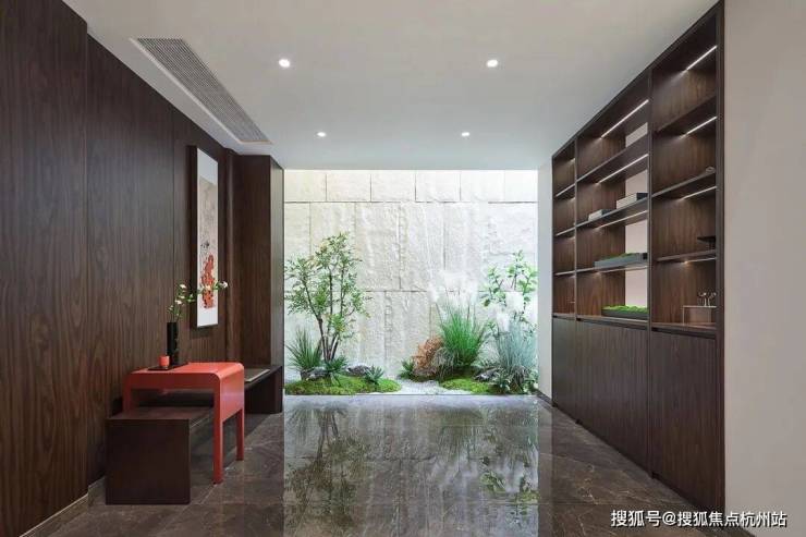 礼序中庭 山水观心府门承袭中式府邸的传统对称性布局,再现温润如玉的礼序空间,温润优雅 艺术行旅以黑白色为主基调,陈设杭州非遗铜刻,串联龙坞茶园美景,带来非凡艺术盛宴