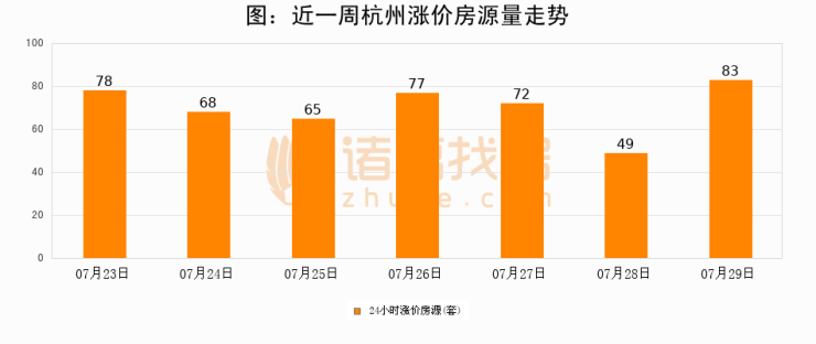 根据诸葛找房数据显示,杭州24小时涨价房源量为83套,较07月28日增加34套,环比上涨69.4%。与此同时,涨价房源占比小幅扩大,业主信心有所提升。