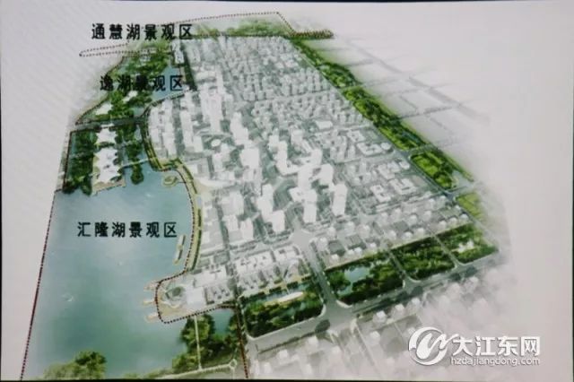 翻开大江东规划国土建设局委托设计的规划图,这里将是一个体现杭州滨水特色的城市中心,三个湖泊连接起了整个区域。汇龙湖、通慧湖、逸湖三大湖体相互连通,将北面的研发办公区、科研高教区,以及南面的综合居住区、水岸休闲区等有机串联起来,湖面、田野、公园、湿地等生态景观与城市功能融为一体,形成绿色、生态、令人惬意的生活环境和研发办公环境。