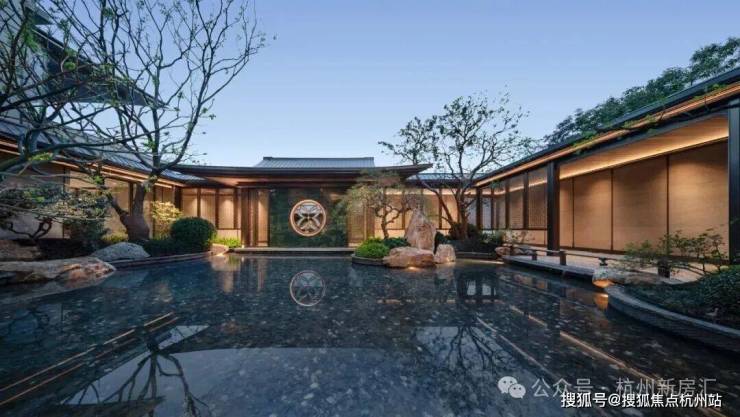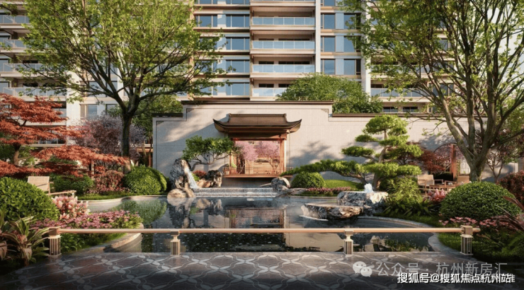 采用“王府中式”设计,大门为歇山顶形制(宽53米、高近11米),配黄铜狮、罗汉松及蓝翡翠奢石。园林融入西湖十景元素,如“花港观鱼”水景、“柳浪闻莺”绿植,并设雾森系统首层单元门厅石材铺就,肌理沉稳。