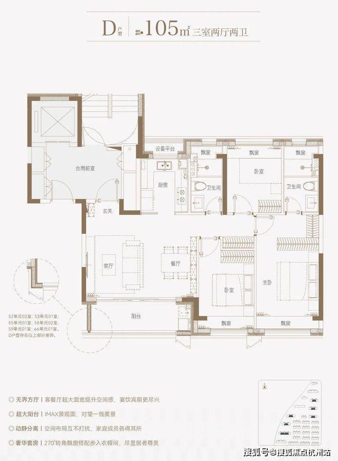 边套的餐厅、主卧和次卧,设置有多个270°全景飘窗,室内通透明亮。