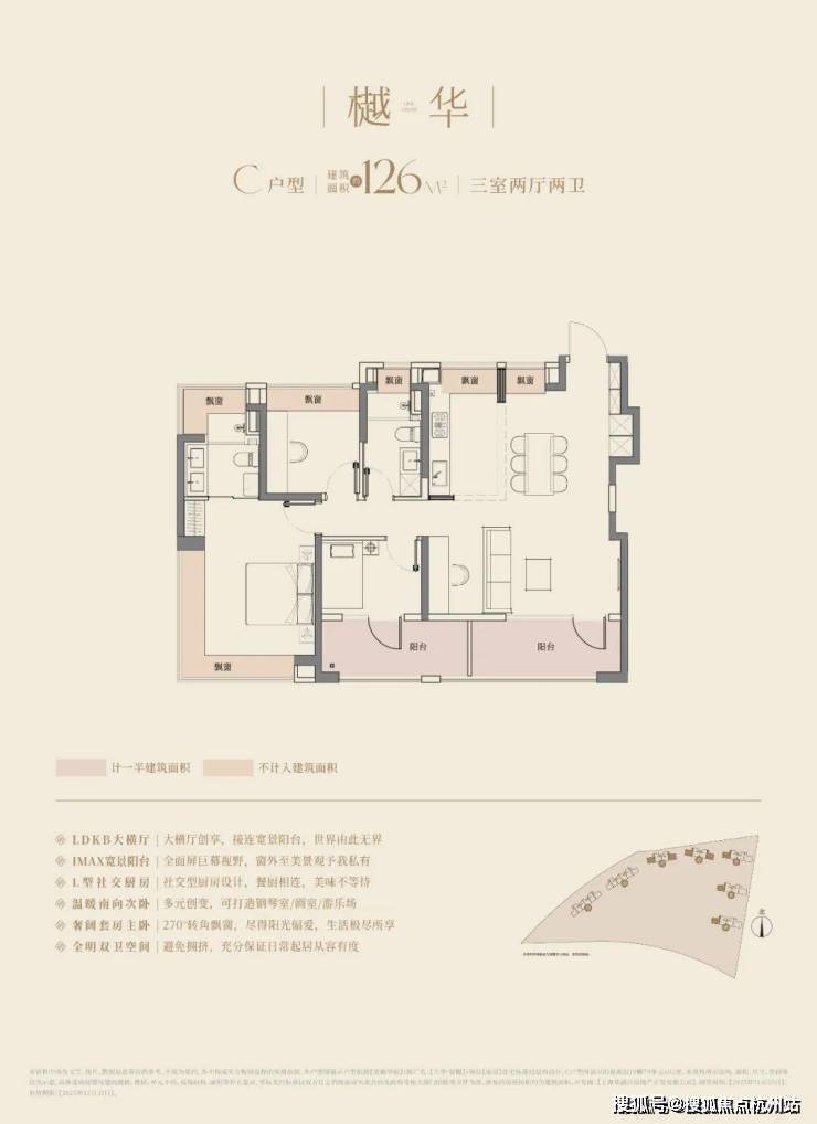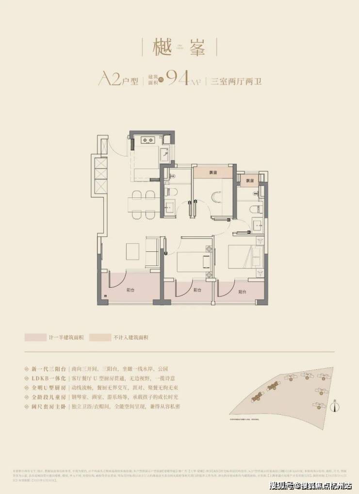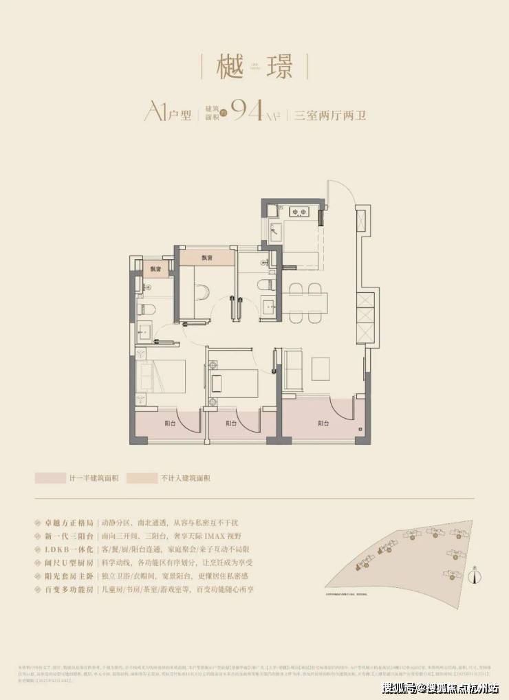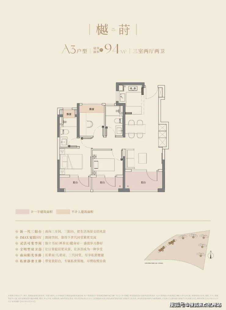 大华望樾的高层建面约94㎡户型做到了三阳台的配置;