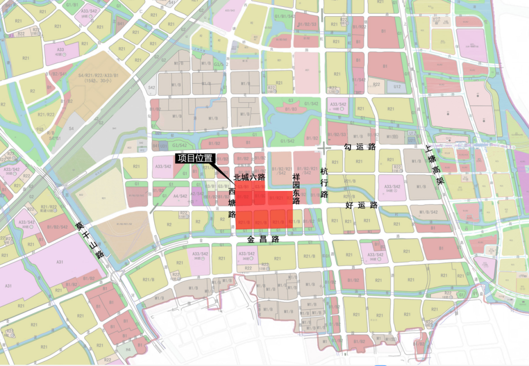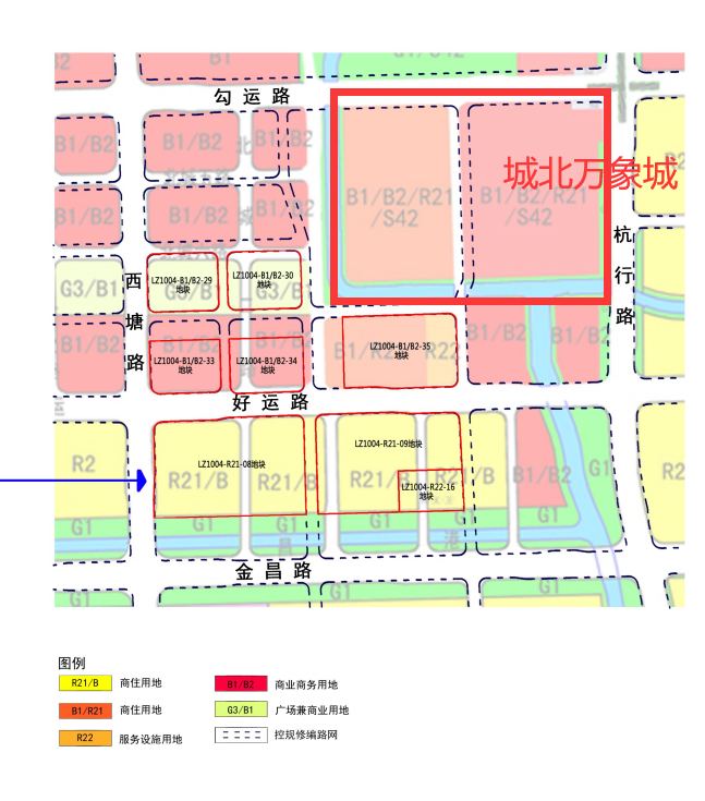 在城北万象城的东北面,杭行路与勾运路交叉口西北角,也规划有一宗商业用地。