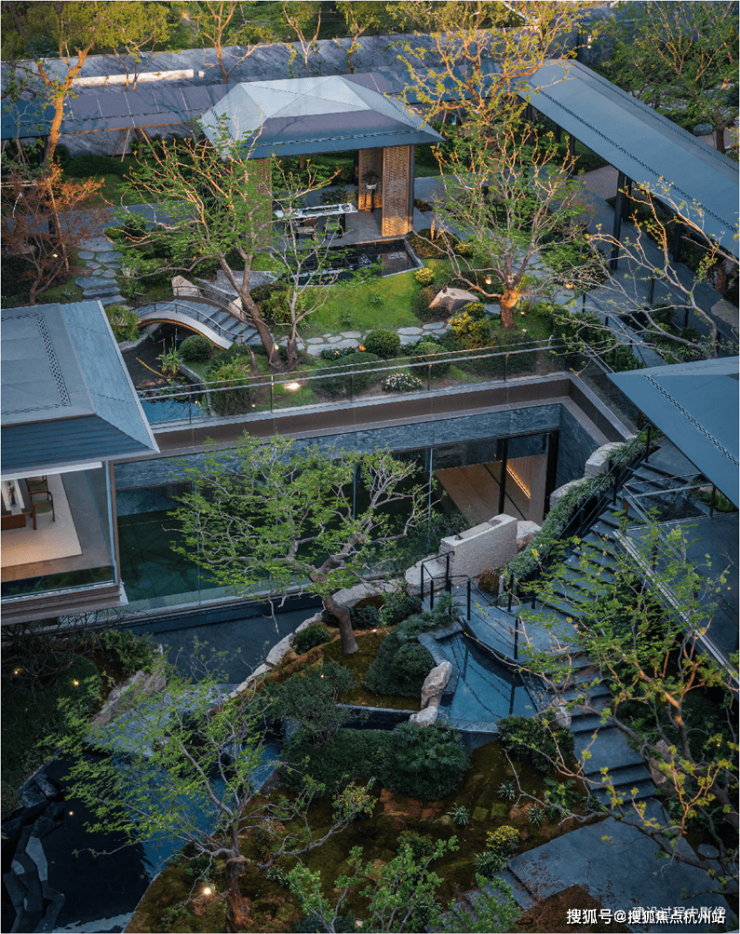 而最令人惊艳的,当属约6米地势差打造的下沉式山水庭院,山、石、水、林有序交织,犹如一幅“豁然开朗”山水轴卷,每一步皆是景致,每一处皆有不同。