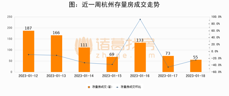 从存量房来看,2023年01月18日杭州存量房单日成交55套,比昨日减少18套,环比下降24.7%。从近一周存量房成交来看,杭州存量房日均成交套数为113套,其中01月12日成交量最高为187套,01月18日单日成交55套,低于近一周平均水平51.3%。